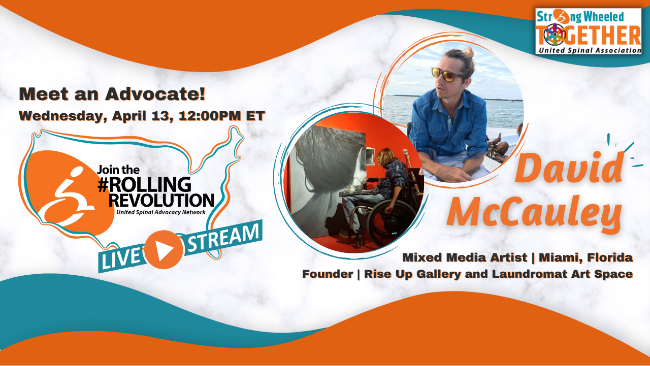 The guest advocate will be David McCauley, an award-winning mixed media artist living with paralysis, based in Miami, FL. He is the founder of The Rise Up Gallery and The Little Haiti Laundromat Art Space. Bring your questions and comments to be part of this live conversation as David talks about his advocacy efforts and how he approaches inclusivity, universal design, accessibility, and the physical state of the human body through his adaptive mark making techniques. You can read more about David on his website at https://www.davidmccauleyart.com/.