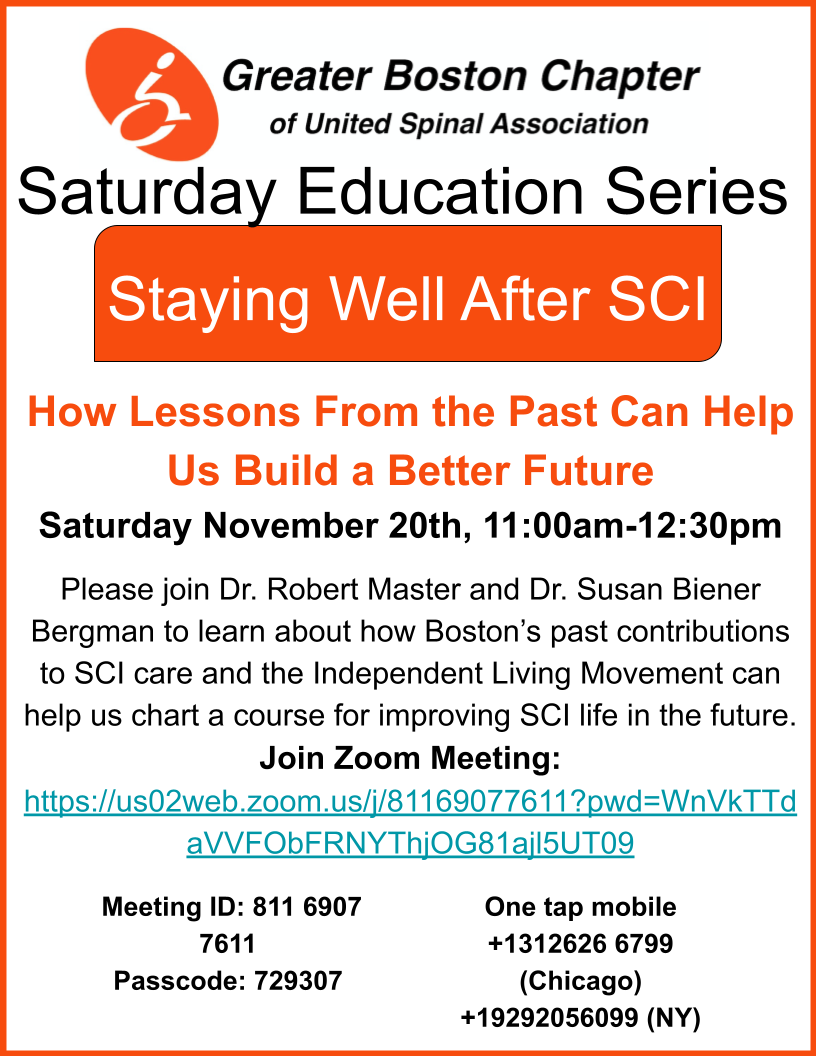 Please join Dr. Robert Master and Dr. Susan Biener Bergman on November 20 to learn about how Boston’s past contributions to SCI care and the Independent Living Movement can help us chart a course for improving SCI life in the future.