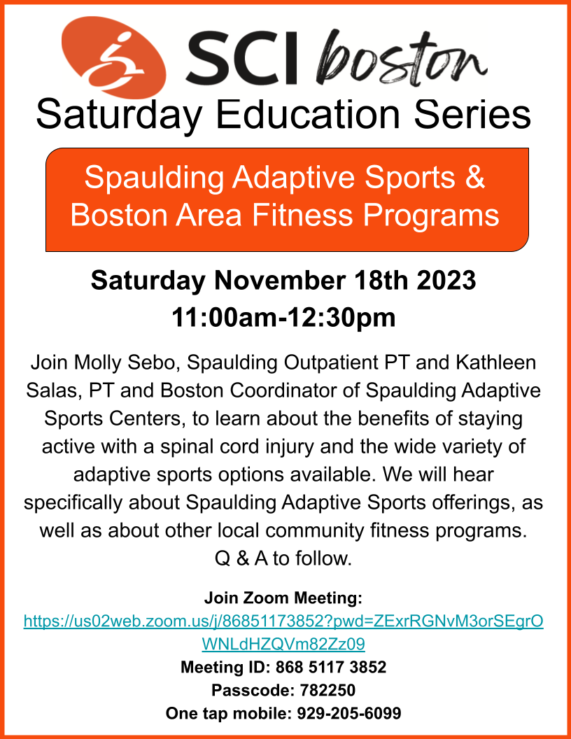 Join Molly Sebo, Spaulding Outpatient PT and Kathleen Salas, PT and Boston Coordinator of Spaulding Adaptive Sports Centers, to learn about the benefits of staying active with a spinal cord injury and the wide variety of adaptive sports options available. We will hear specifically about Spaulding Adaptive Sports offerings, as well as about other local community fitness programs.
