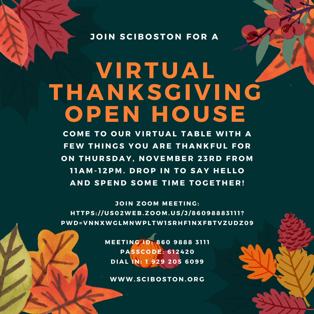 Virtual Thanksgiving Open House, Thursday November 23rd, 11AM-12PM EST Come to our “virtual table” with a few things for which you are thankful for! Drop in to say hello and spend some time together! *There will be no SCI Group at 4pm or Family Group at 5pm this day* See flyer below.