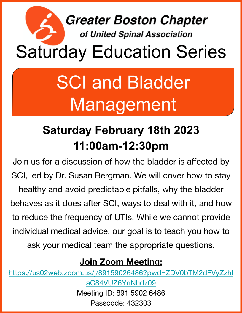 Join us for a discussion of how the bladder is affected by SCI, led by Dr. Susan Bergman. We will cover how to stay healthy and avoid predictable pitfalls, why the bladder behaves as it does after SCI, ways to deal with it, and how to reduce the frequency of UTIs. While we cannot provide individual medical advice, our goal is to teach you how to ask your medical team the appropriate questions.